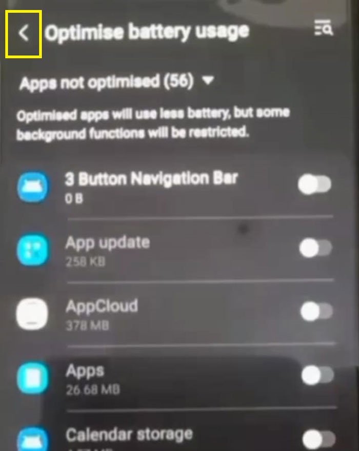 C Step 7 : Slide toggle left side. In some phone two options may appear – Select Don't Optimize and disable battery optimisation. If it does not work, try to optimize again and now disable.