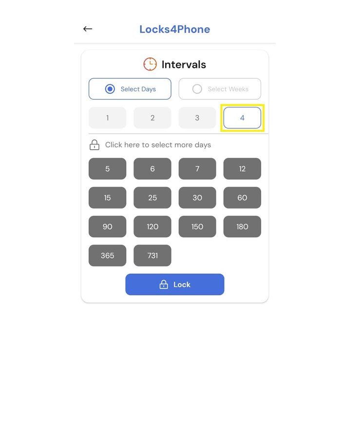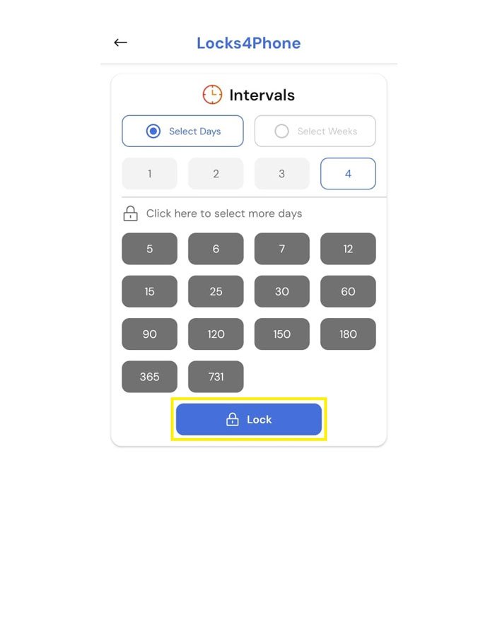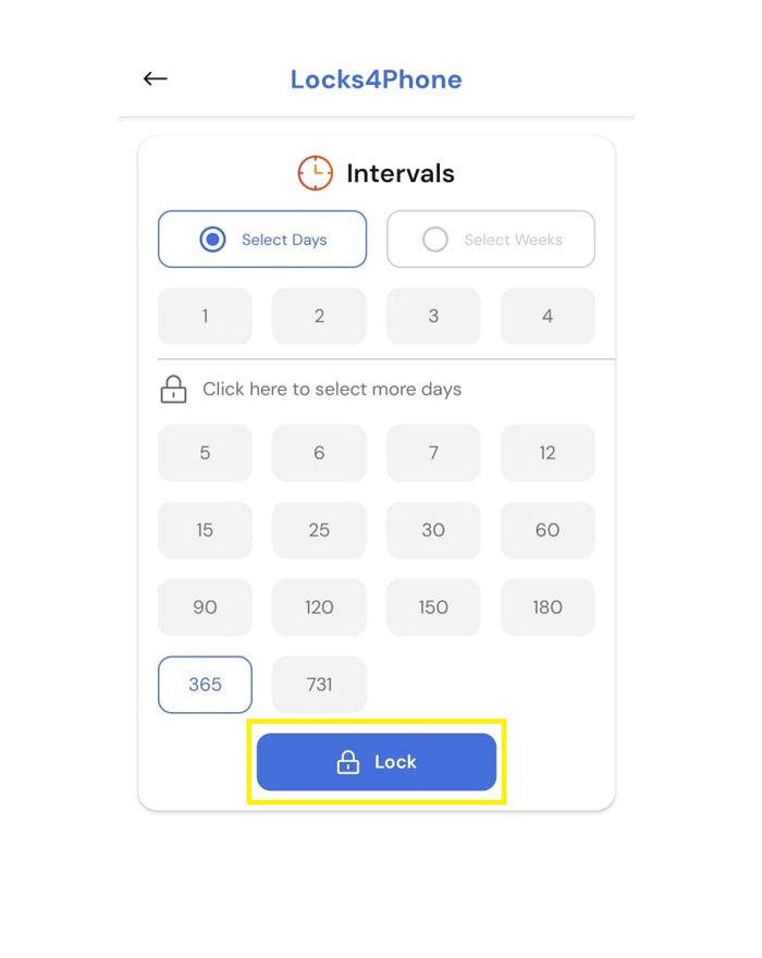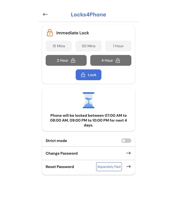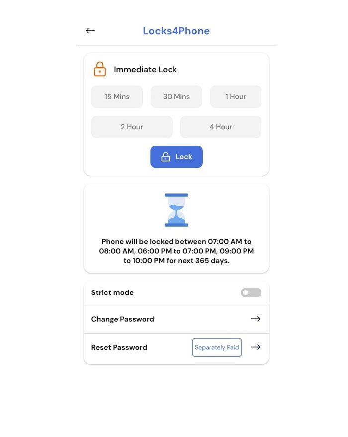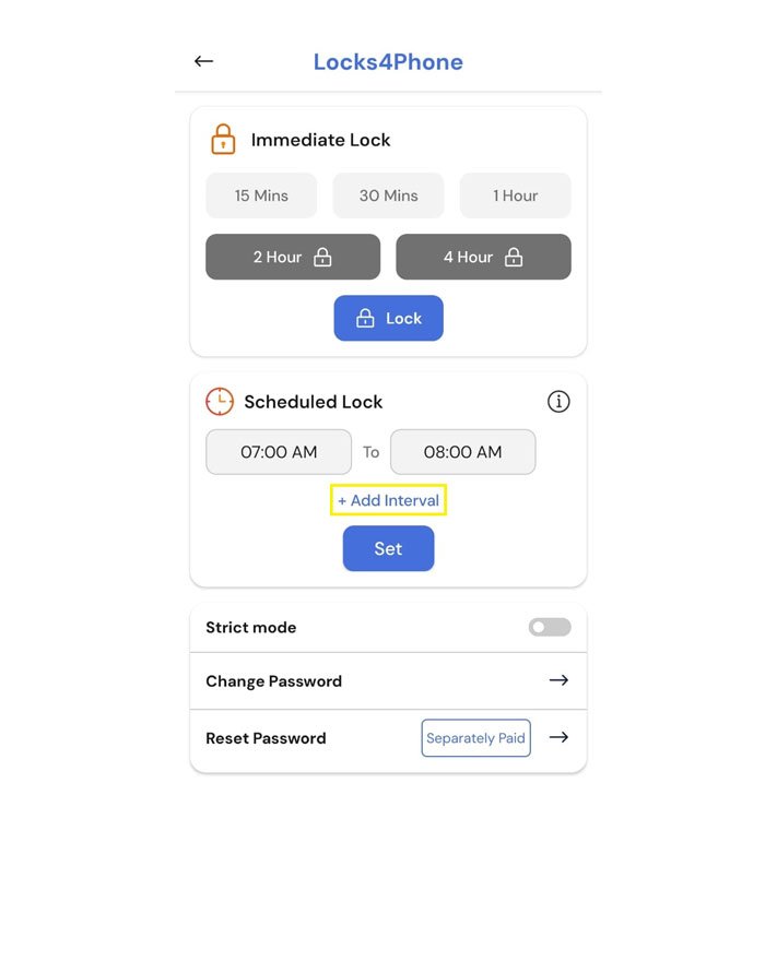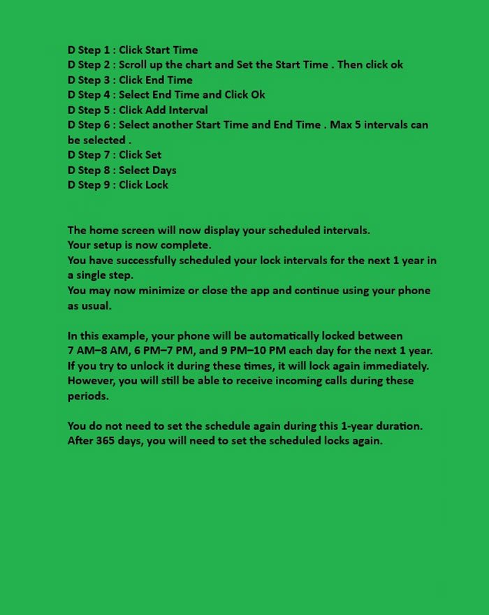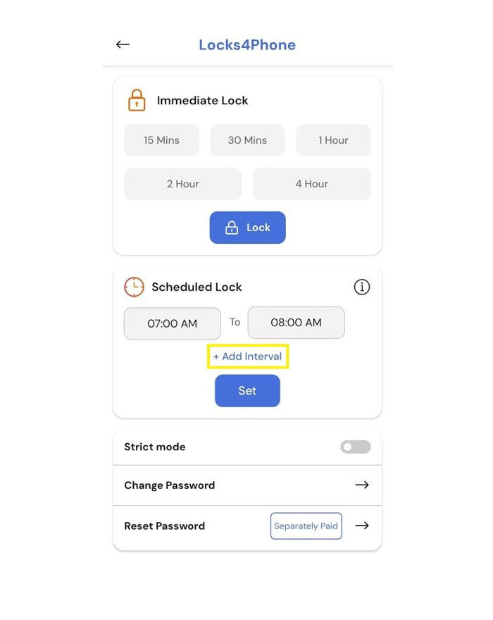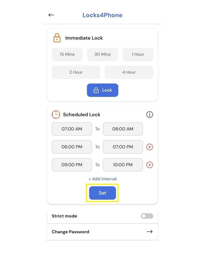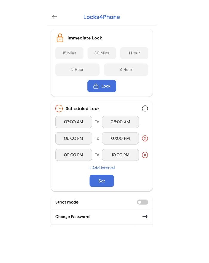 The home screen will now display your scheduled intervals. Your setup is now complete. You have successfully scheduled your lock intervals. You may now minimize or close the app and continue using your phone as usual.