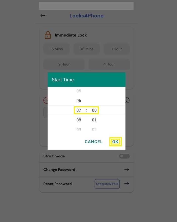 In this example, your phone will be locked automatically between 7 AM–8 AM and 9 PM–10 PM. If you try to unlock it during these times, it will lock again immediately.However, you will still be able to receive incoming calls during this period. After 4 days, you will need to set the scheduled locks again.